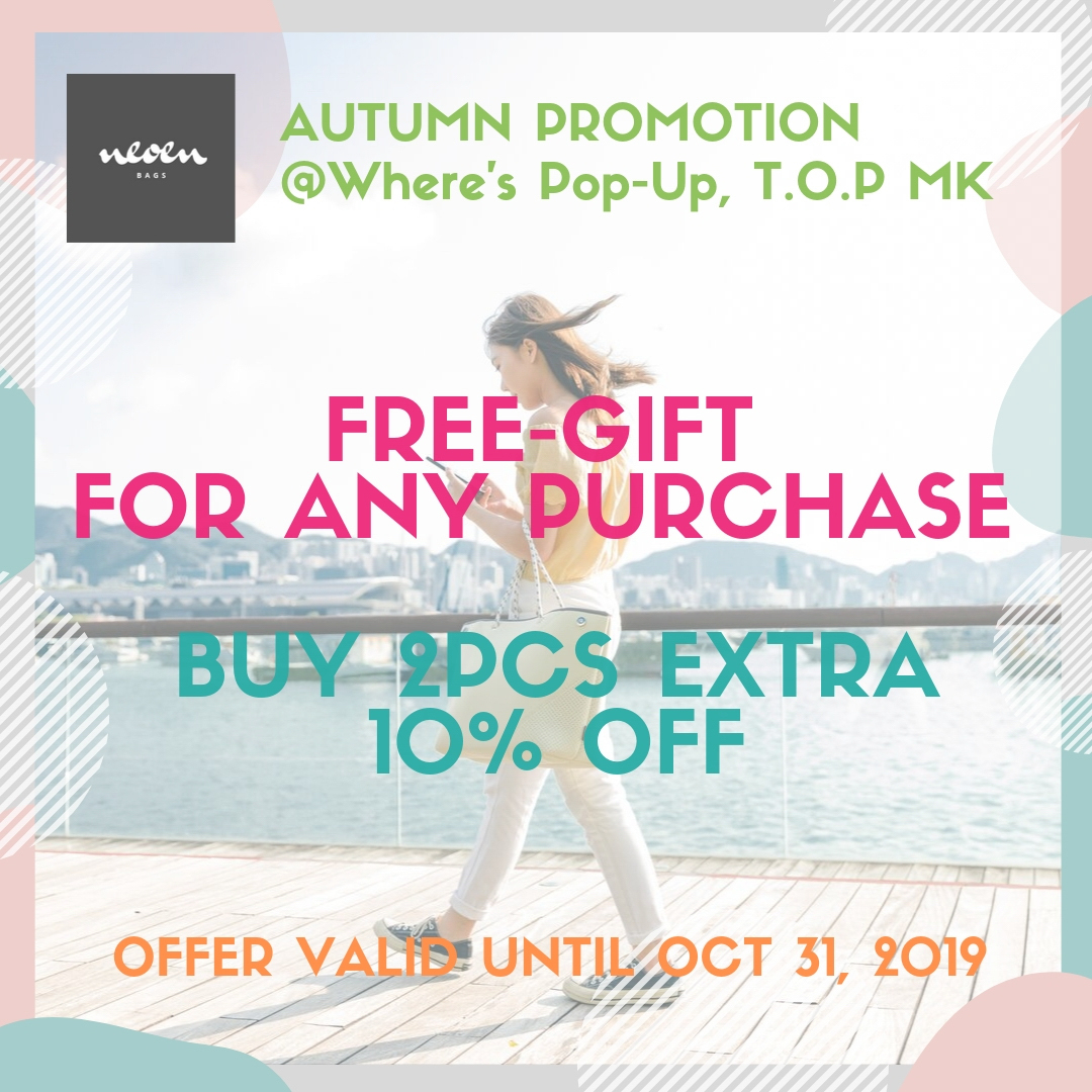 現於我們旺角T.O.P Where,s Pop Up Store 購買Neoen任何手袋,即可獲贈小儲物袋一個。若買兩個更享9折優惠!快d同朋友一齊黎睇吓啦!